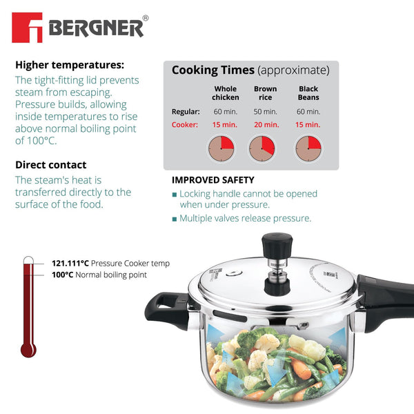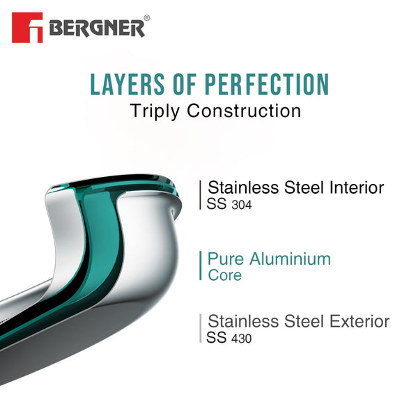 Details: Discover the Bergner BE Bergner Essentials Tripro Triply Stainless Steel Pressure Cooker, the ultimate kitchen companion for fast, healthy cooking. Engineered with advanced triply construction, this 3-liter cooker ensures even heat distribution for perfectly cooked meals every time. The innovative easy lock system guarantees a secure seal, while the non-toxic safety valve provides peace of mind during cooking. Featuring a conventional whistling system, you’ll always know when your food is ready. The ergonomic, rivetless handle offers a comfortable grip and prevents food buildup, making cleanup a breeze. Suitable for all cooktops, including induction and gas, this versatile cooker adapts to any kitchen setup. Enjoy nutritious meals that retain their flavors, and experience the convenience of quick cooking with minimal effort. With the Bergner Tripro Pressure Cooker, you can elevate your culinary skills and make healthy eating simple and enjoyable. Transform your cooking experience today!