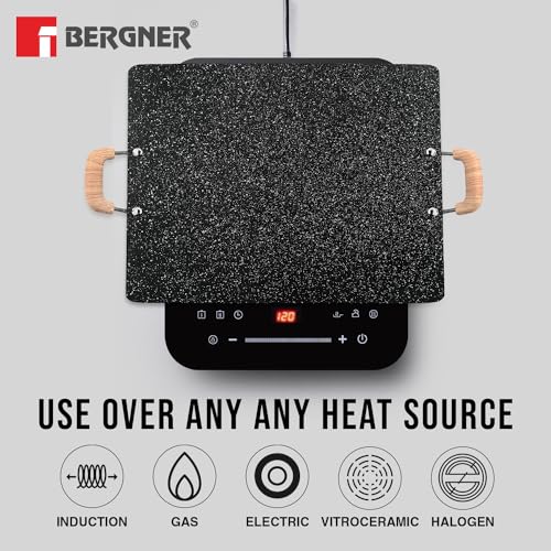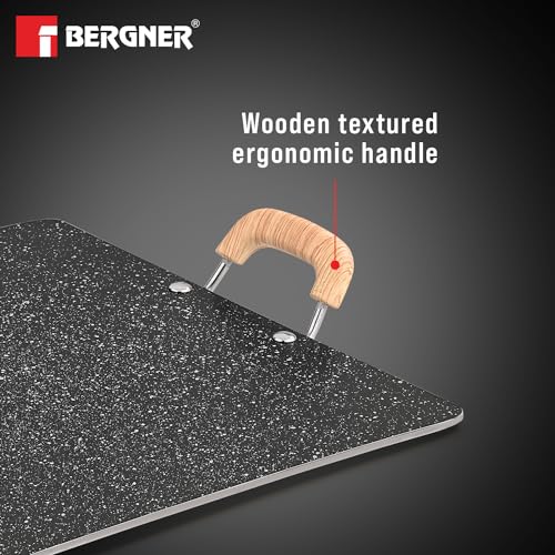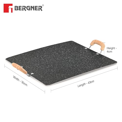 Bergner Bellini Plus Aura 5-Layer Non-Stick 30cm Pathri Tawa, Flat Rectangle Pathri Tawa with Soft Touch Wooden Finish Handle, PFOA Free, 4mm Thickness, Induction Bottom, Black