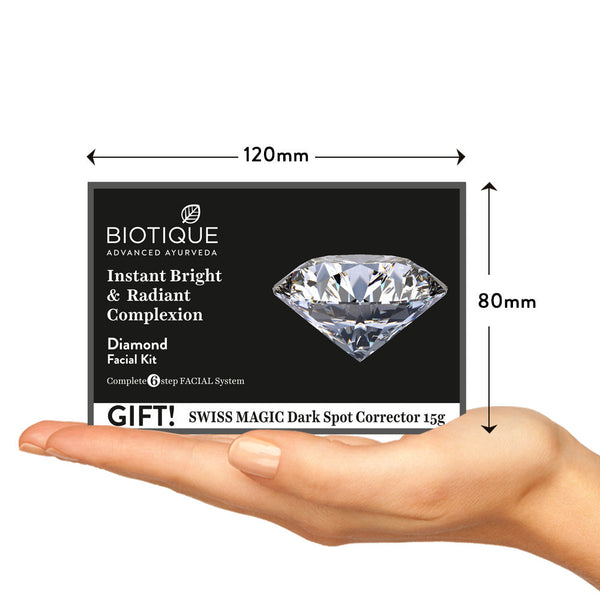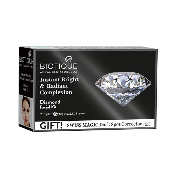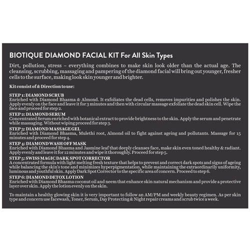 | DESCRIPTION Dirt, pollution, stress – everything combines to make skin look older than the actual age. The cleansing, scrubbing, massaging and pampering of the diamond facial will bring out younger, fresher cells to the surface, making look skin younger and brighter. | | INGREDIENTS THIS PACK CONTAINS: 1.DIAMOND SCRUB -10gm 2.DIAMOND SERUM-10gm 3.DIAMOND MASSAGE GEL-10gm 4.DIAMOND WASH OFF MASK -10gm 5.DIAMOND DETOX LOTION -10gm 6.SWISS MAGIC DARK SPOT CORRECTOR -15gm | | HOW TO USE? STEP 1: DIAMOND SCRUB:Enriched with Diamond Bhasma & Almond. It exfoliates the dead cells, removes impurities and polishes the skin. Apply evenly on the face and leave it for 3 minutes and then with circular massage exfoliate the dead skin cell. Wipe the face and proceed for step 2. STEP 2: DIAMOND DETOX LOTION:Enriched with Diamond Bhasma coconut oil and neem that enhance skin natural mechanism and provide a protective layer over skin. Apply the lotion evenly on the skin. STEP 3: DIAMOND MASSAGE GEL:Enriched with Diamond Bhasma, Mulethi root, Almond oil to fight against ageing and pollutants. Massage for 15 minutes and proceed for step 4. STEP 4: DIAMOND WASH OFF MASK:Enriched with Diamond Bhasma and Jasmine leaf that deeply cleanses face, make skin even toned healthy & radiant. Apply evenly and leave it for 12 minutes and wipe it thoroughly. Proceed for step 5. STEP 5: DIAMOND SERUM:Concentrated Serum enriched with botanical extract to provide brightness to the skin. Apply the serum and penetrate while massaging. STEP 6: SWISS MAGIC DARK SPOT CORRECTOR:A concentrated formula with light melting fresh texture that helps to prevent and correct dark spots and signs of ageing while balancing the skin's tone and minimizes hyperpigmentation, while maintaining the extraordinarily uniformity, luminous and youthful skin. Apply Dark Spot Corrector to the specific area of concern. | Country of Origin: India Name of Mfg / Importer / Brand: Bioveda Action Research Company Address of Mfg / Importer / Brand: 42, Rampur Ghat Rd, Paonta Sahib, Himachal | | |