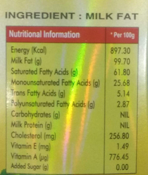 Details: Made from cow's milk by adopting traditional procedures and meeting stringent quality standards. A taste of purity. This special grade ghee is quality assured to make foods; sweet dishes; kheers and sweets flavorsome and mouth-watering.