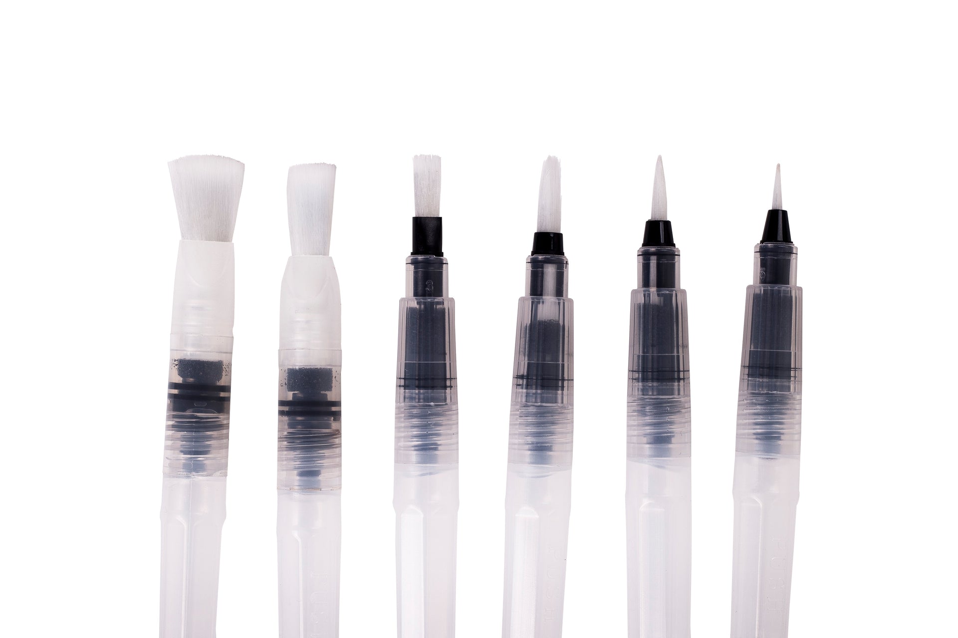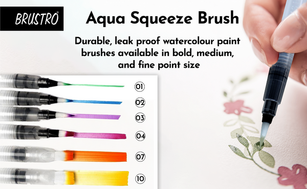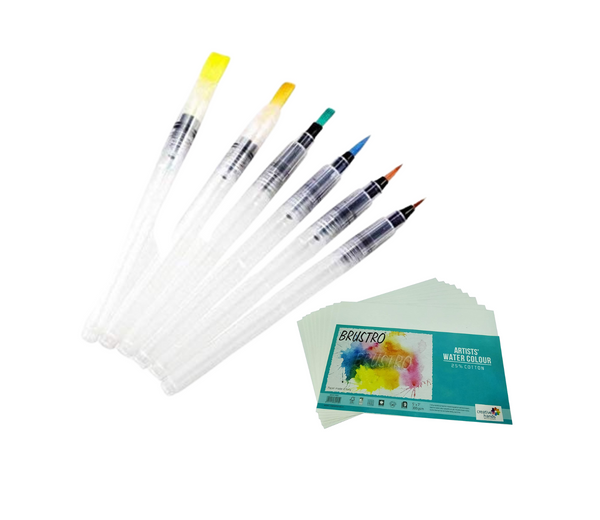 Brustro 3 Flat and Round Aqua Squeeze Leak Proof Watercolour Brush Pen with 9 Sheets Paper Cotton CP 300 GSM, 5x7-inch (Assorted) - Set of 6