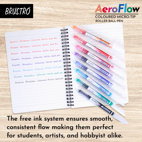 BRUSTRO AeroFlow Coloured Micro-Tip Roller Ball Pen | Tip size - 0.5 mm - Set of 8 |Leakproof, Quick Dry, Acid-Free, Non-Toxic,Fade Resistant,Ideal for Drawing,Doodling, Office, Stationery, School use