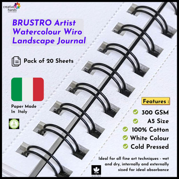 - 100% Cotton, chlorine & acid-Free. Cold Pressed. 300 GSM, Size – A5 Wiro Bound Journal, Landscape, 20 Sheets