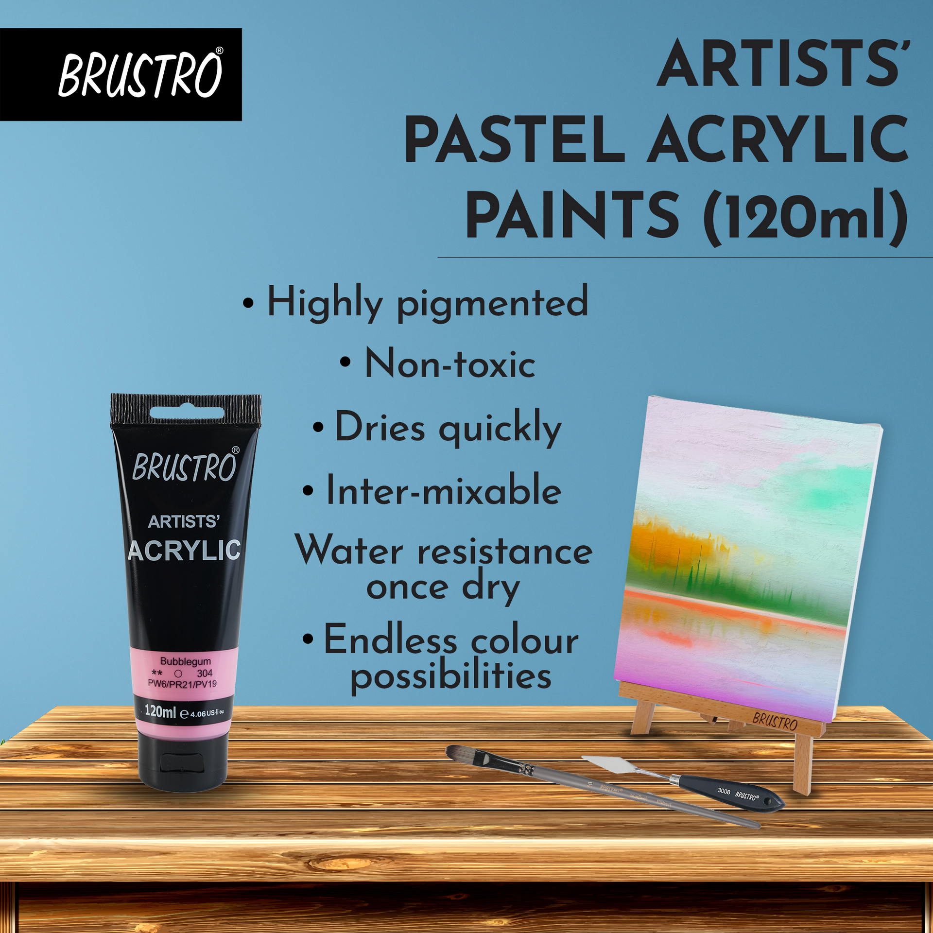 - Brustro acrylics are affordable colours that can be used to paint on all conventional art surfaces such as paper, cardboard, canvasses etc. These soft bodied colours can be used straight from the tube as they wet easily on to the surface or they can be thinned with water. All the colours are inter-mixable giving endless colour possibilities. Best price quality ratio. These Acrylic Paints are perfect to create textured effects, brush marks and palette knife impressions.