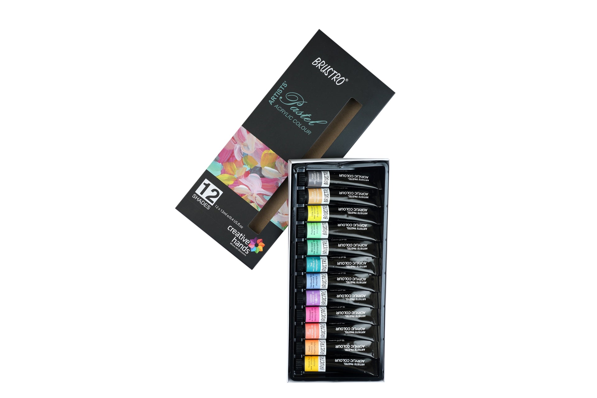 Brustro acrylics are colours that can be used to paint on all conventional art surfaces such as paper, cardboard, canvasses etc. These soft bodied colours can be used straight from the tube as they wet easily on to the surface, or they can be thinned with water. All the colours are inter-mixable giving endless colour possibilities. Contains Tuscan Sun, Peach, Coral, Bubblegum, Lavender, Cornflower Blue, Teal, Mint Green, Pistachio Green, Lime Green, Sand and Fossil.