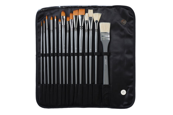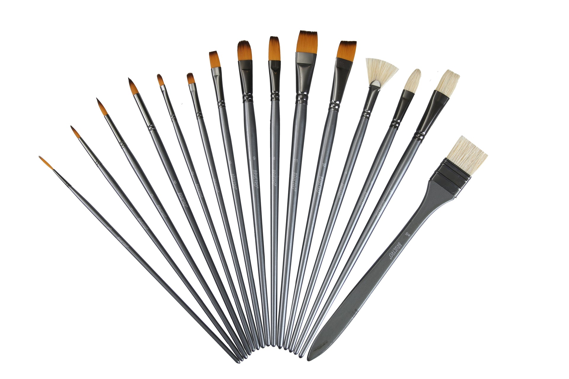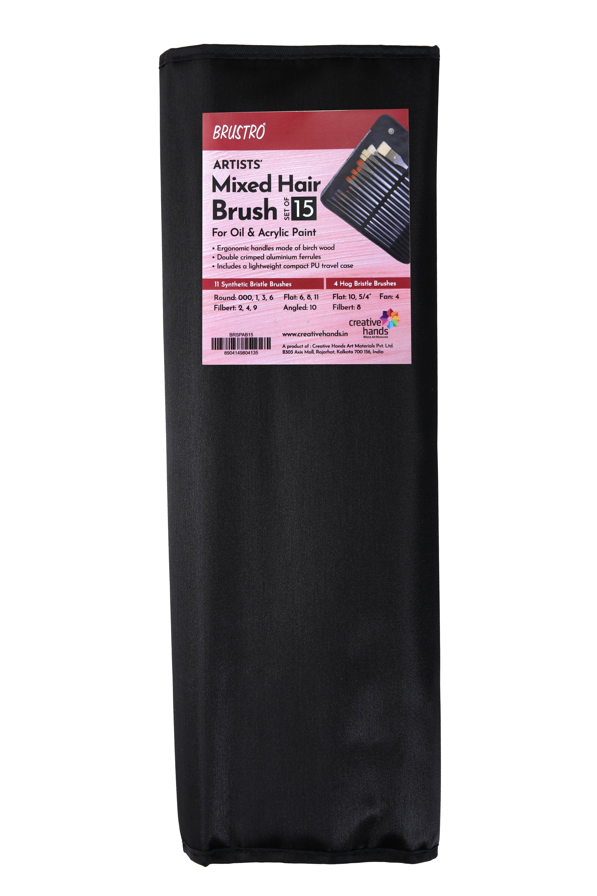 FOR OIL ACRYLIC AND WATERCOLOUR WORKS FOR ALL PAINT TYPES - This brush set can be used for oil paints, acrylic paints and even water colour paints; these brushes are also very versatile as there a mix of 4 natural hog hair bristle brushes and 11 synthetic bristle brushes to create the brush strokes you need. SPEND MORE TIME ENJOYING PAINTING YOUR MASTERPIECE - These professional quality paint brushes are custom designed to last longer with better components. ALWAYS HAVE THE RIGHT BRUSH FOR YOUR PAINTING STYLE - This ergonomically designed long handled paint brush set includes 15 paint brushes including 5 flat paint brushes, 1 fan brush, 4 round brushes, 4 filbert brushes and 1 angle brush, so you can paint in every style you want.MADE FROM FINEST MATERIALS. Handles made of birch wood and secured with double crimped aluminium ferrules for absolute durability assurance. FREE BRUSH HOLDER TRAVEL CASE: The brush set comes with lightweight, compact carrying case to make going to your studio or art class easier. Brustro is a registered trademark of Creative Hands Art Materials Pvt. Ltd.