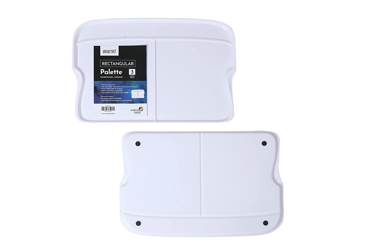 - Somatology design with comfortable grip ideal for both right and left handed artists. 4 non-skid bumpers at the base to prevent sliding 2 Central mixing areas with raised perimeter for smaller portions of colour