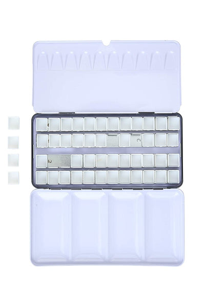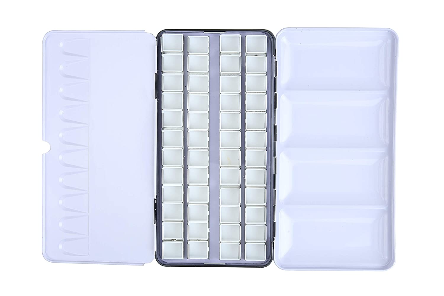 Includes 48 empty half pans which are detachable Each pan can hold upto 2ml of watercolour paint. Sturdy, reusable metal box. Black enamel exterior and white enamel interior. Foldout palette attached as the inner lid. Metal ring under the box to give a proper grip.