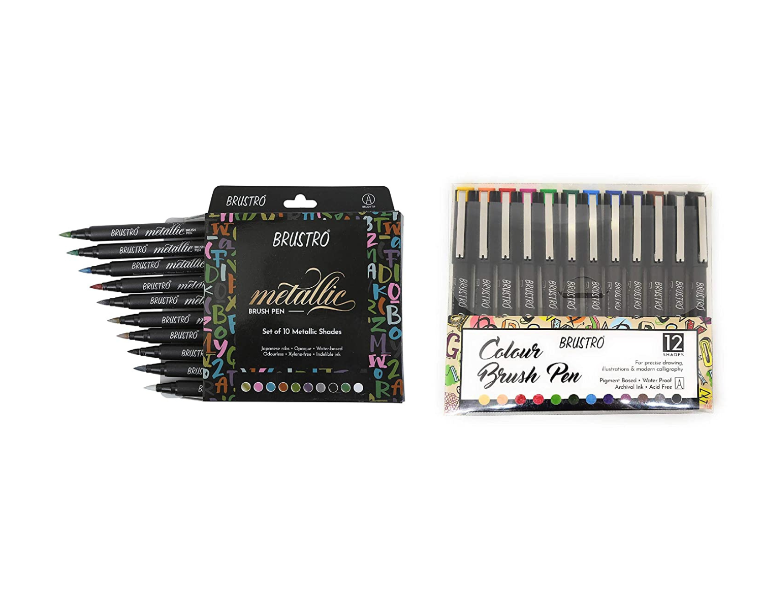 - BRUSTRO Metallic Brush Pens - Soft Brush Tip Set of 10 Colors. with Colour Brush Pens Set of 12 (Pigment Based, Hard tip Brush Pen) Flexible tip for Calligraphy, Lettering and Drawing Techniques.