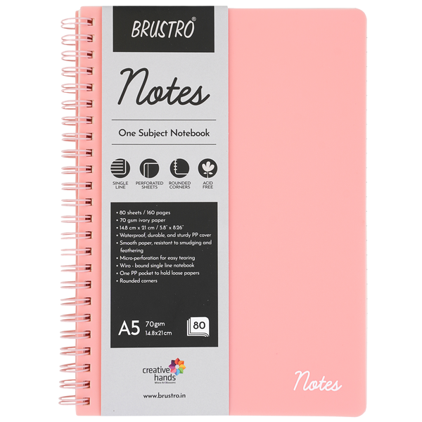 BRUSTRO Notes A5 Size, 1 Subject Ruled Notebook, 80 sheets / 160 pages, 70 gsm ivory paper, Blush Cover
