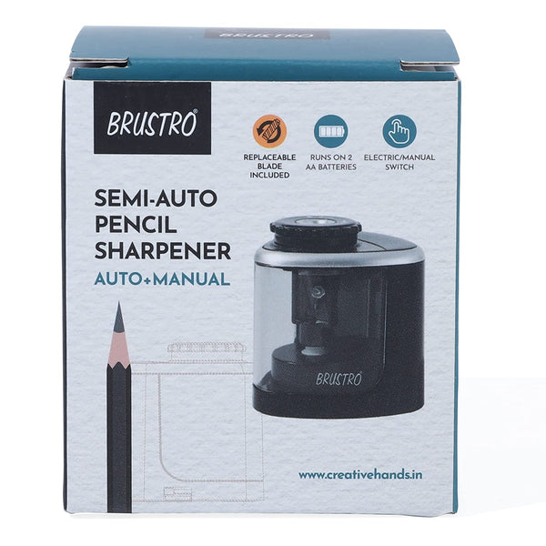 Works both with battery and manual mechanism. Sturdy and aesthetic. Fits pencils with diameter 6-8mm. Gives sharp points in seconds. Runs on 2 AA batteries (not included). Auto -manual switch to change mode of sharpening. SK2 blade gives sharp and durable point. Replaceable blade included. Large transparent shaving bin. Non -skid rubber feet.,