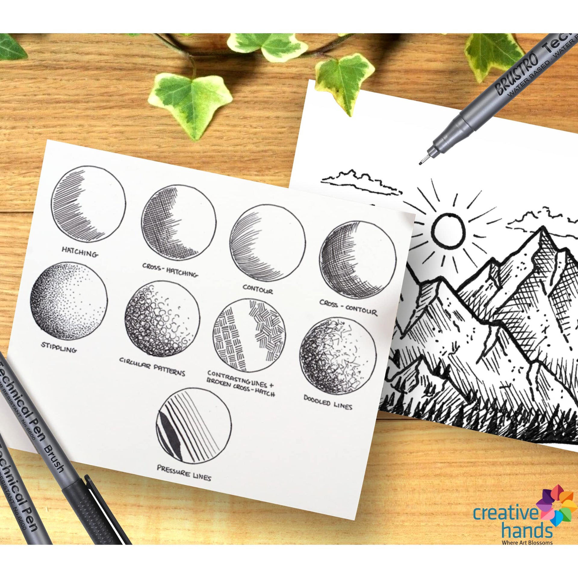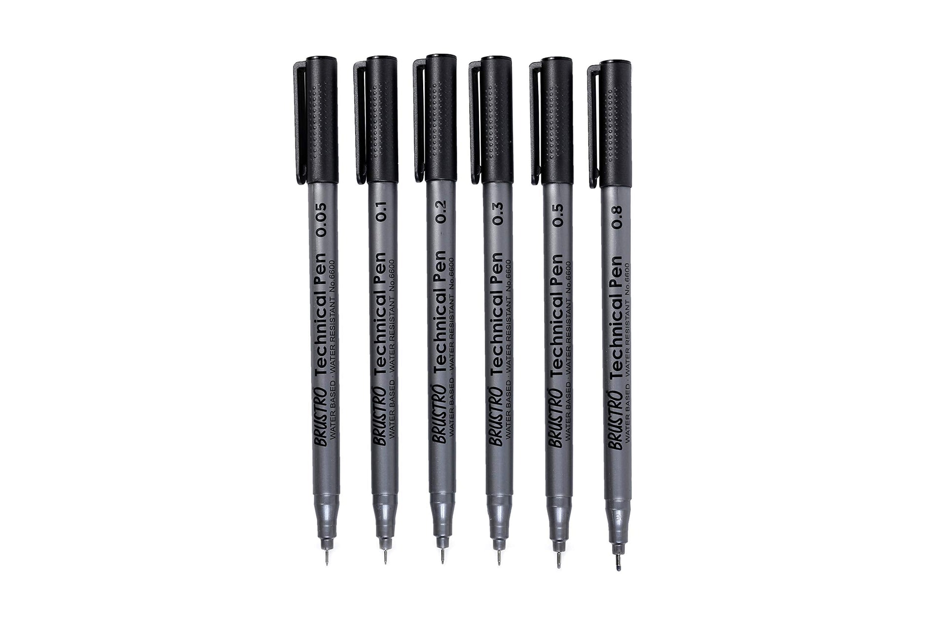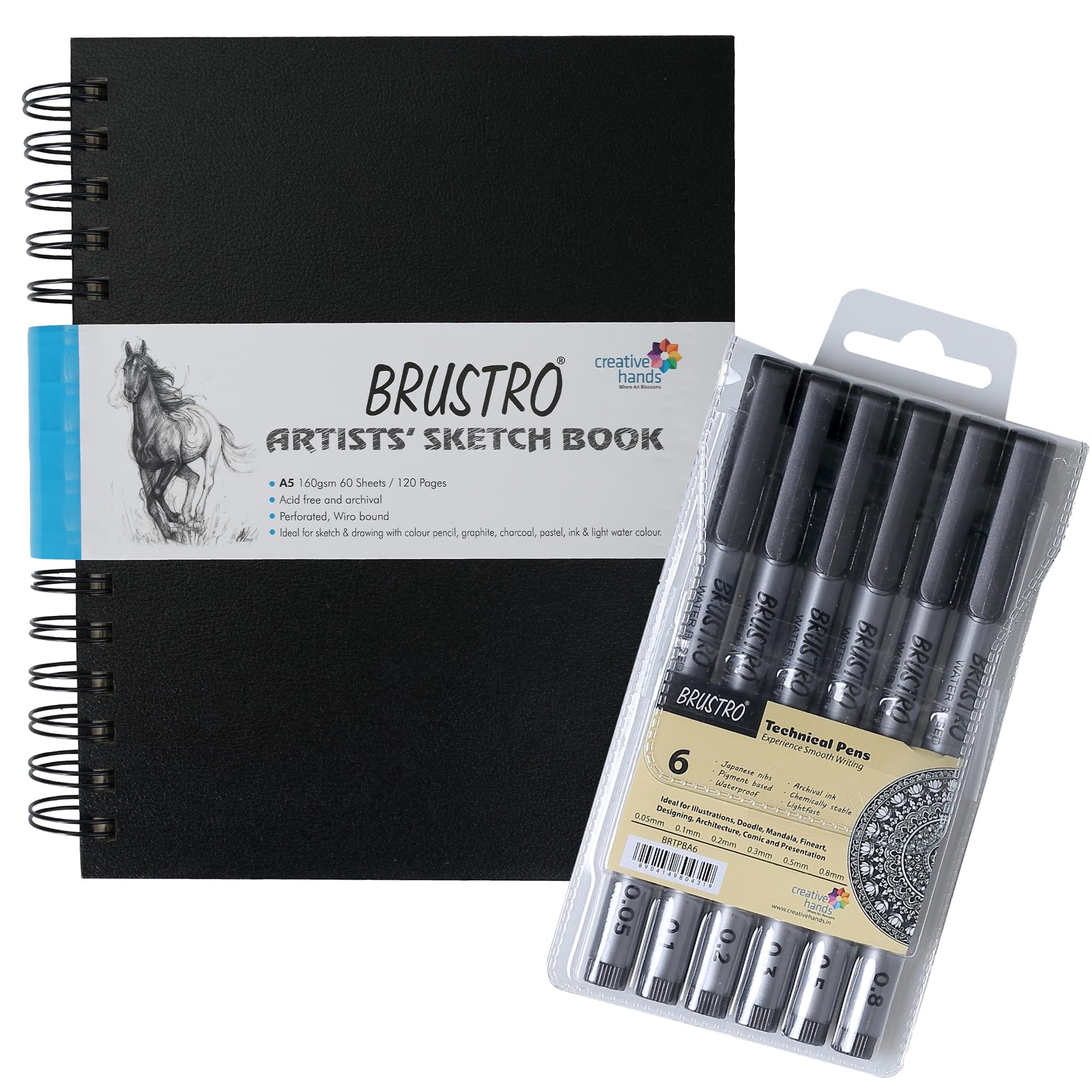 BRUSTRO Technical Pen Assorted Set of 6 with Artist Sketch Book 110 GSM A5 Wiro Journal (156 Pages)