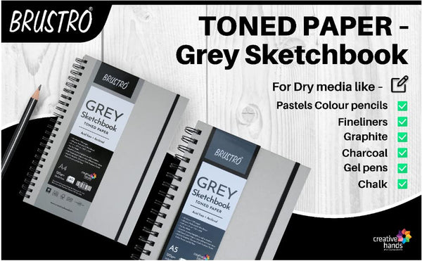 BRUSTRO Toned Paper - Grey Sketchbook | A4, 120 GSM | 60 Sheets/120 Pages | Wiro Bound, Spiral, Premium, Acid-free Paper, Ideal for Dry media, Mandala Art, Graphite, Charcoal, Colour pencils, Gel pens