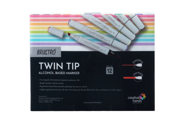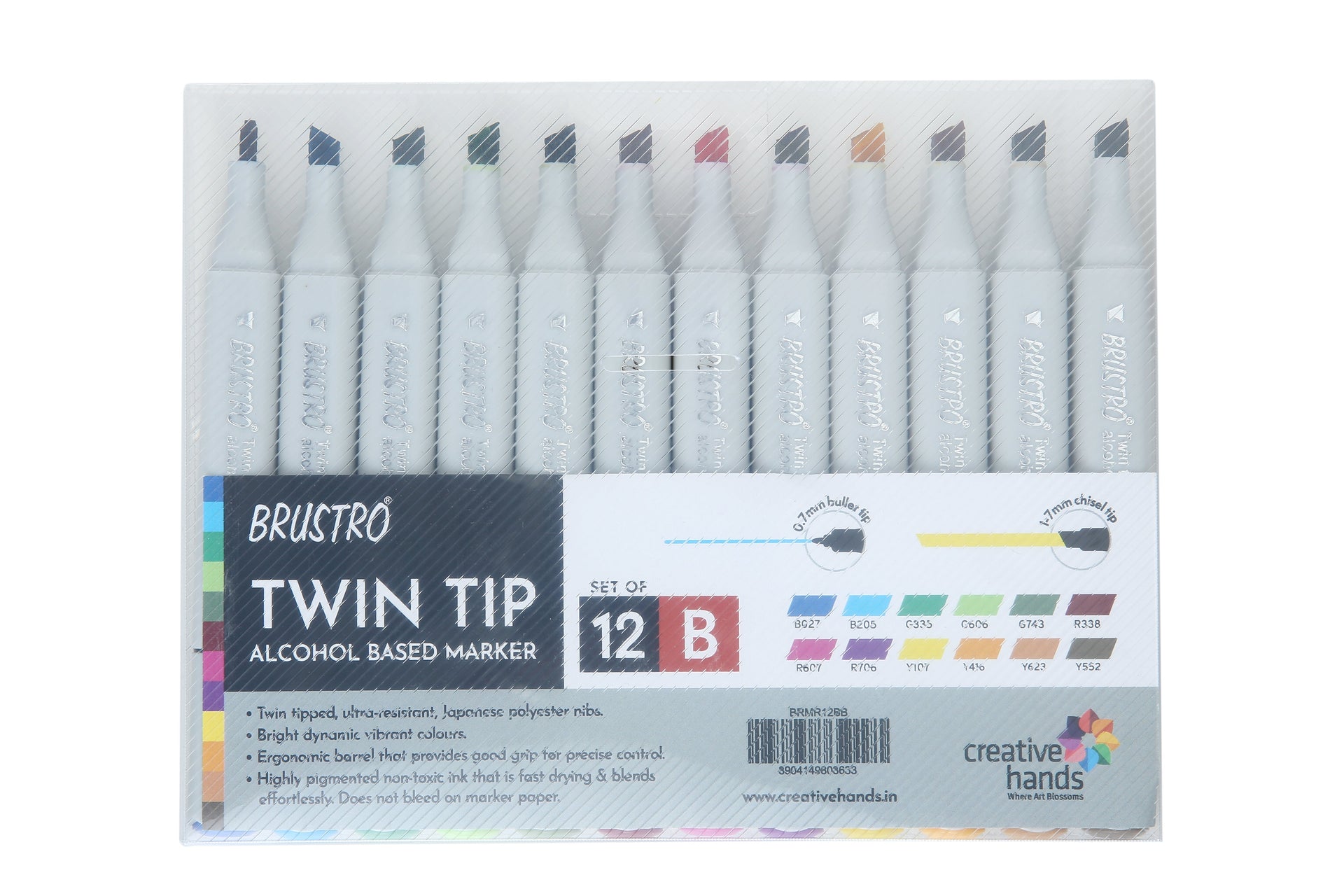 - BRUSTRO Twin Tip Alcohol Based Marker Set of 12 - Basic B in Crossline PP See Through Box