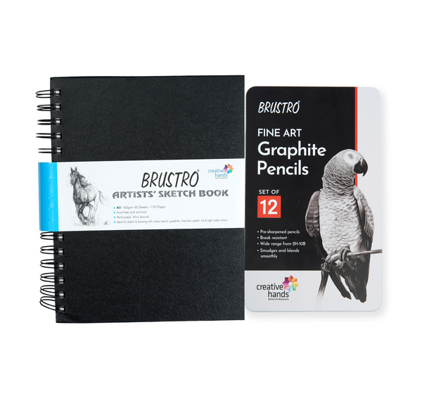 - Brustro Wiro Bound A5 Size Artists Sketch Book, 120 Pages, 160 GSM and BRUSTRO Artists ’ FINEART Graphite Pencil Set of 12 (10B-2H)