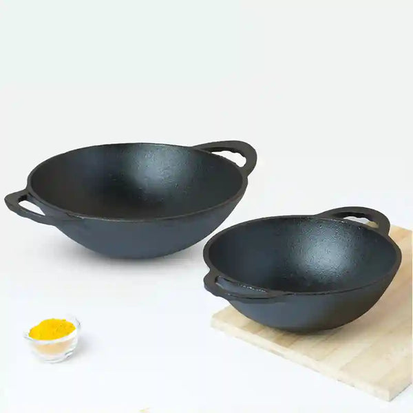 β³LASTS FOR GENERATIONS: The cast iron cookware generally is great for everyday cooking. Because of its thickness and durability, this cast iron kadai set will last life long, even for generations. The cast iron kadais have 2 strong, curved handles which give you a firm grip for easy and safe cooking.Β