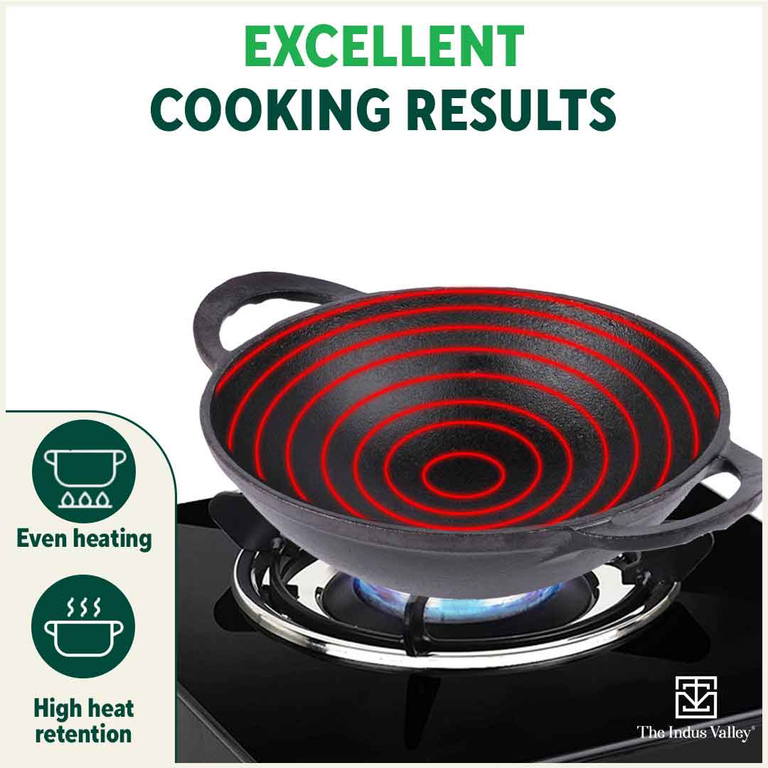πEXCELLENT COOKING RESULTS: These kadais support even heating and retains heat for a long time. Buy this cast iron kadai set online on The Indus Valley and experience a superior performance with consistent cooking results.