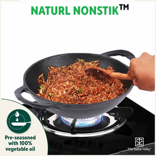 πͺ100% NATURAL & TOXIN-FREE: The Indus Valley Pre-seasoned Cast Iron Kadai Combo - having 1.4L Kadai + 2.2L Kadai is made from 100% pure cast iron. This kadai with twin curved handles is completely toxin free - with no harmful artificial or chemical coating. Truly a healthier alternative to non-stick kadais that have toxic coatings!