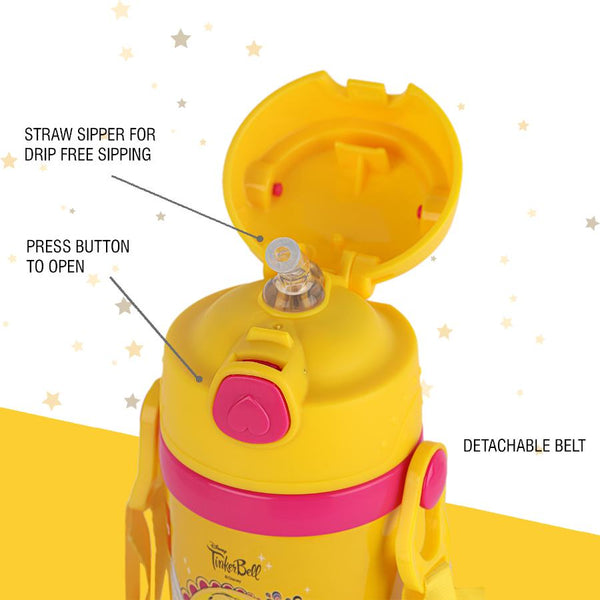 Introducing the Champ 400 water bottle by Cello Kidzbee, perfect for kids who are always on the go! With a 400ml capacity and cool designs like Tinker Bell and Spiderman, it's both fun and functional. Available in Yellow, Red, Blue, and Sky Blue, it's easy to match your style. The push-button straw sipper and adjustable neck strap make it easy to use and carry. Plus, the double-wall vacuum insulation keeps drinks cool on hot days. Its wide cap and flip top ensure a leak-proof seal, even when on its side. Stay hydrated, cool, and stylish with the Champ 400 water bottle!