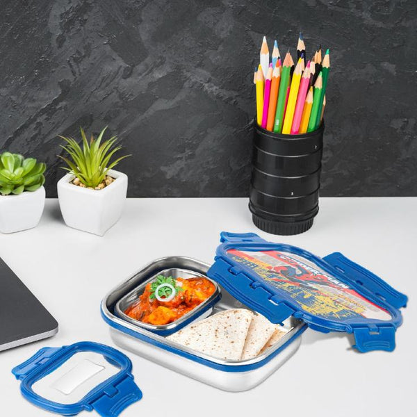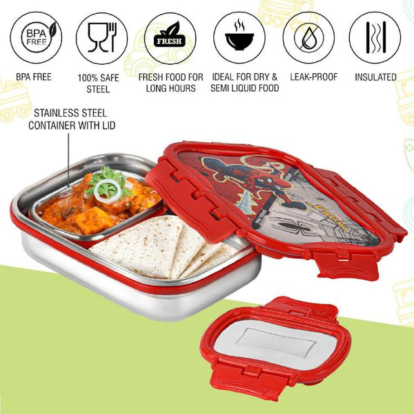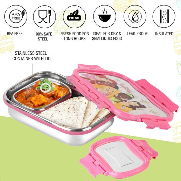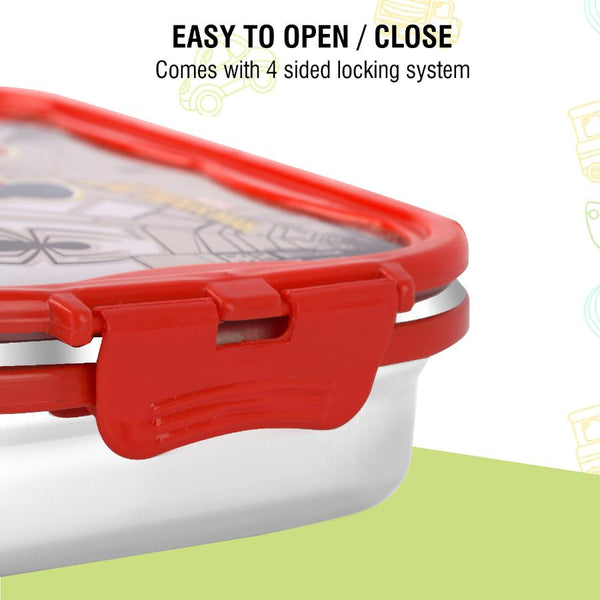 Introducing the Cello Kidzbee Click It Toons Stainless steel Lunch Box – a dynamic mealtime companion for kids! A compact lunch box with kiddie prints, durable stainless steel material, and vivid colours that is perfect for school, picnics, and camping. The lightweight design fits easily in backpacks, while side locks and an airtight lid keep food fresh and secure. Inside, a leakproof steel container accommodates gravies and snacks. Stylish, functional, and safe, the Cello Kidzbee Click It Toons Lunch Box comes in Red, Blue, Pink and Violet with Disney Princesses and Spiderman making lunchtime exciting for every child.