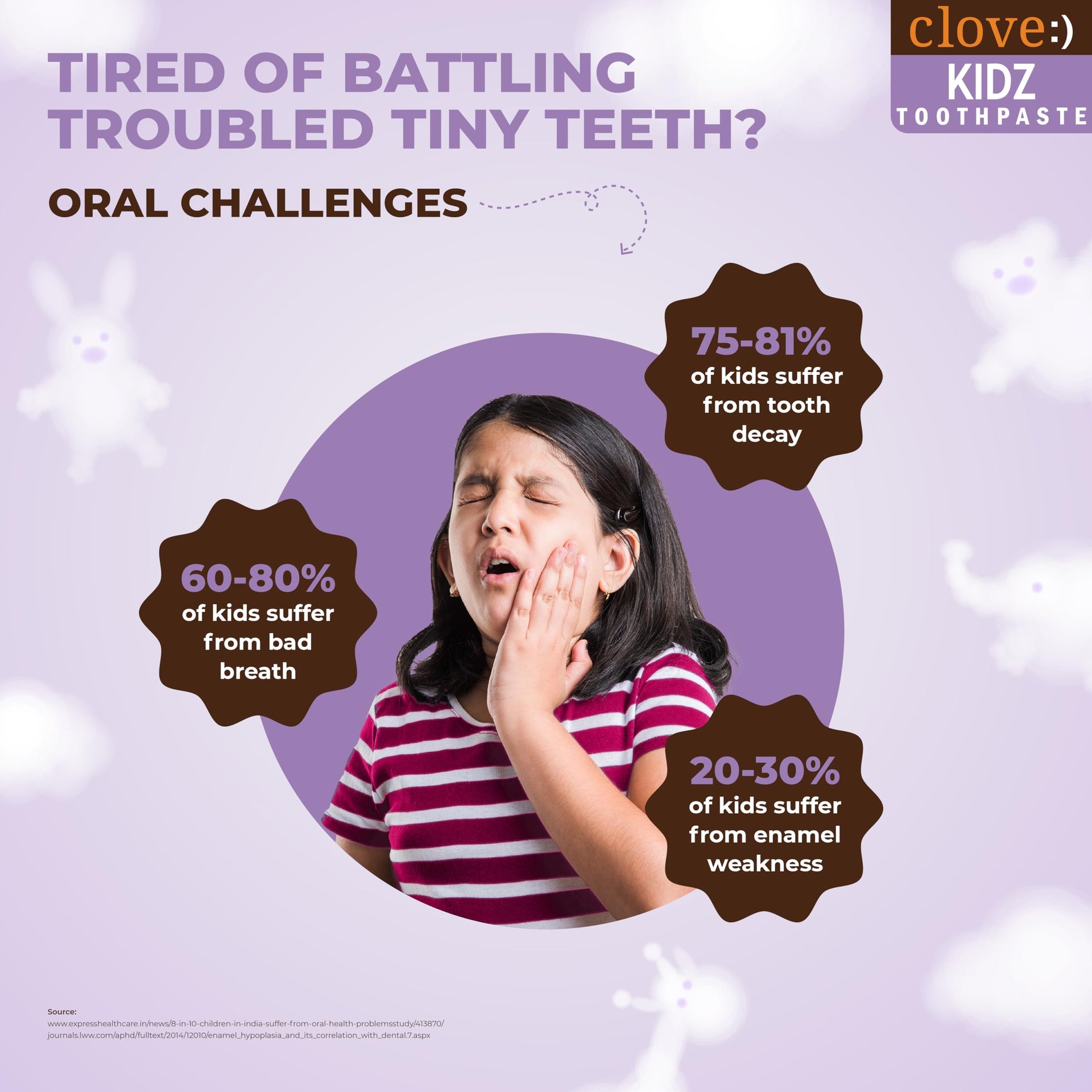 Details: Kids must brush their teeth at least 2 times a day- once in the morning and in the night. Clove Kids toothpaste comes with 0% percent artificial flavors and sweetener so you donβt have to worry about exposing your kid to Unhealthy ingredients. It contains age-appropriate fluoride levels (supervise to minimize swallowing). This delicious natural strawberry-flavored premium toothpaste, specially designed for kids of 3+ years, turns brushing battles into a breeze. Moms often find it difficult to get their little ones to brush their teeth every day, therefore, Clove Kids toothpaste offers a fun way to ensure they enjoy good oral care habits early on! Clove Kids comes In Two Colours Paste That Turns Purple After Two Min Of Brushing Helps Parents To Identify That Brushing Is Complete. It protects against cavities and strengthens the soft enamel of little teeth helping them scoot their way to healthy smiles. Usage Instructions: Brush twice a day under parental supervision. Use a pea-sized amount for supervised brushing to minimize swallowing. Ensure children spit out after brushing.