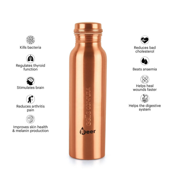 Introducing our Cop-Pura Neer Copper Water Bottle, a 1000ml masterpiece of pure copper craftsmanship. Crafted from 98.99% pure grade "A" copper, this rust-resistant wonder not only quenches your thirst but also offers a plethora of health benefits as per Ayurvedic wisdom. Drinking water from this exquisite bottle, also known as Tamra Jal, promotes healthy skin, aids digestion, combats carcinogens, and harmonizes the body's doshas. The water stored in this bottle turns alkaline, balancing your pH levels, while the inherent antibacterial properties ensure the water remains fresh and pure. Designed to perfection with a sleek, hammered texture, it's not only a health-conscious choice but also a stylish accessory for personal use or gifting.