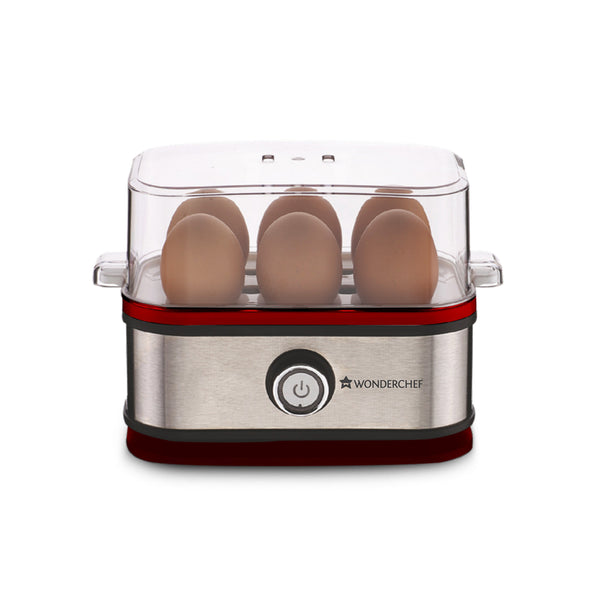Crimson Edge Instant Electric Egg Boiler with 6 Egg Poachers|3 Boiling Modes, Soft, Medium, Hard| Auto Shut Off | Non-stick Egg Rack, Transparent Lid, Stainless Steel Body & Heating Plate, Steamer Rack| Alarm| Overheat Protection | Red| 2 Year Warranty