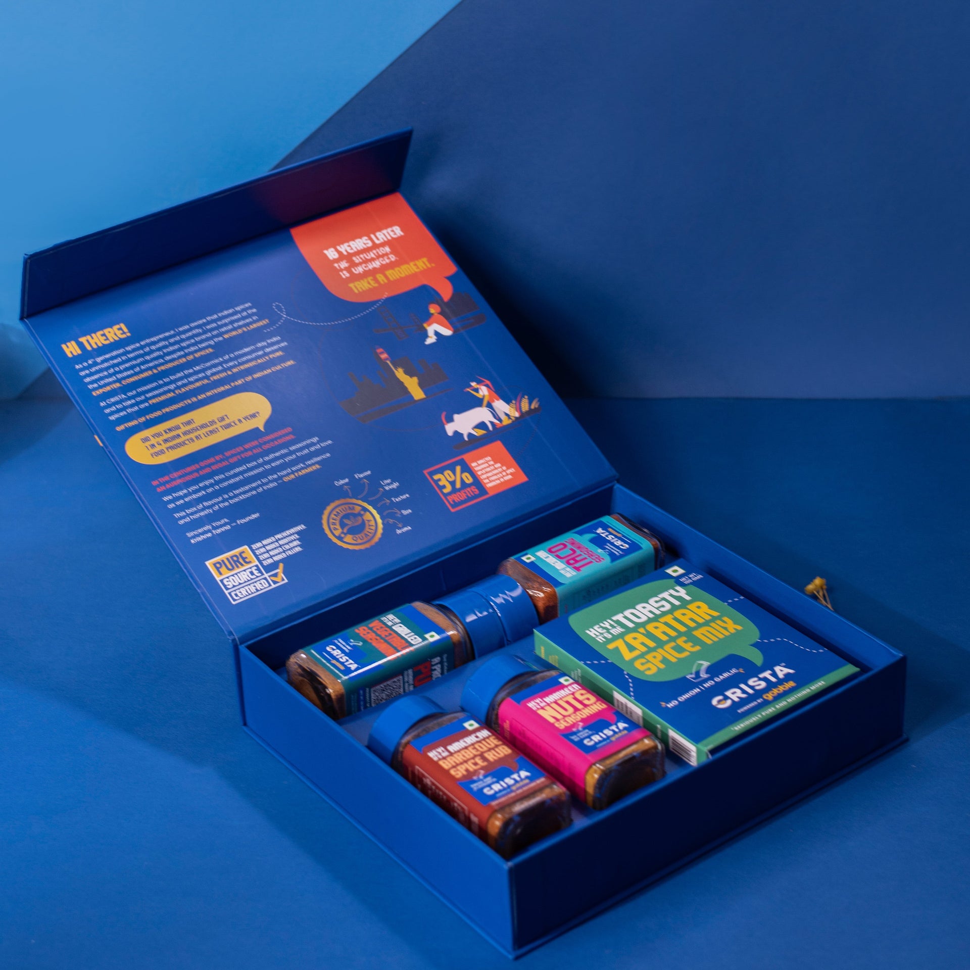 CRISTA Seasonings Gift Boxes are a series of six unique and modern theme oriented gift boxes that consist of a variety of natural, authentic and flavourful Indian and International Seasonings. Baby Showers, Birth Annoucements, Birthdays, Anniversaries, Housewarmings and Festive Occasions like Diwali, Rakshabandhan and Friendship Day are some of the important occasions for which a CRISTA Seasonings Gift Box has been used as the perfect gift to show your appreciation and love towards that special recipient. The Passionately Italian Seasonings Gift Box consists of a modern design, premium packaging and five complex and authentic seasonings and spices that add loads of flavour to any Italian appetizer or entree. Try the earthy yet complex Woody Oregano Seasoning or herb infused Italian Pizza Seasoning for your appetizers or then the very flavourful and delicious Classic Italian Seasoning or Roman Cacio e Pepe Seasoning for pastas. Top of your dish with a judicious use of our signature Smoked Paprika Powder that generates a bit of heat with a lovely smoky essence. The gift box has a product card and note from the 4th generation Founder. Two of the products have a tech enabled QR code offering delectable recipes. CRISTA has pledged 3% of all profits towards various initiatives that empower the families of spice farmers in India.