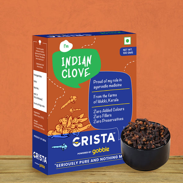 Hey! Its me Indian Clove. Proud of: My role in ayurvedic medicine. Sourced from high range farms in Kerala, premium grade, natural, authentic and pure CRISTA Indian Cloves are characterized by their reddish-brown appearance, large buds and pungent aroma. They are hand cleaned, graded and sorted at the factory, are ideal for everyday Indian cooking and packed with loads of flavour and innumerable health benefits. Cloves are an integral part of most ayurvedic remedies.