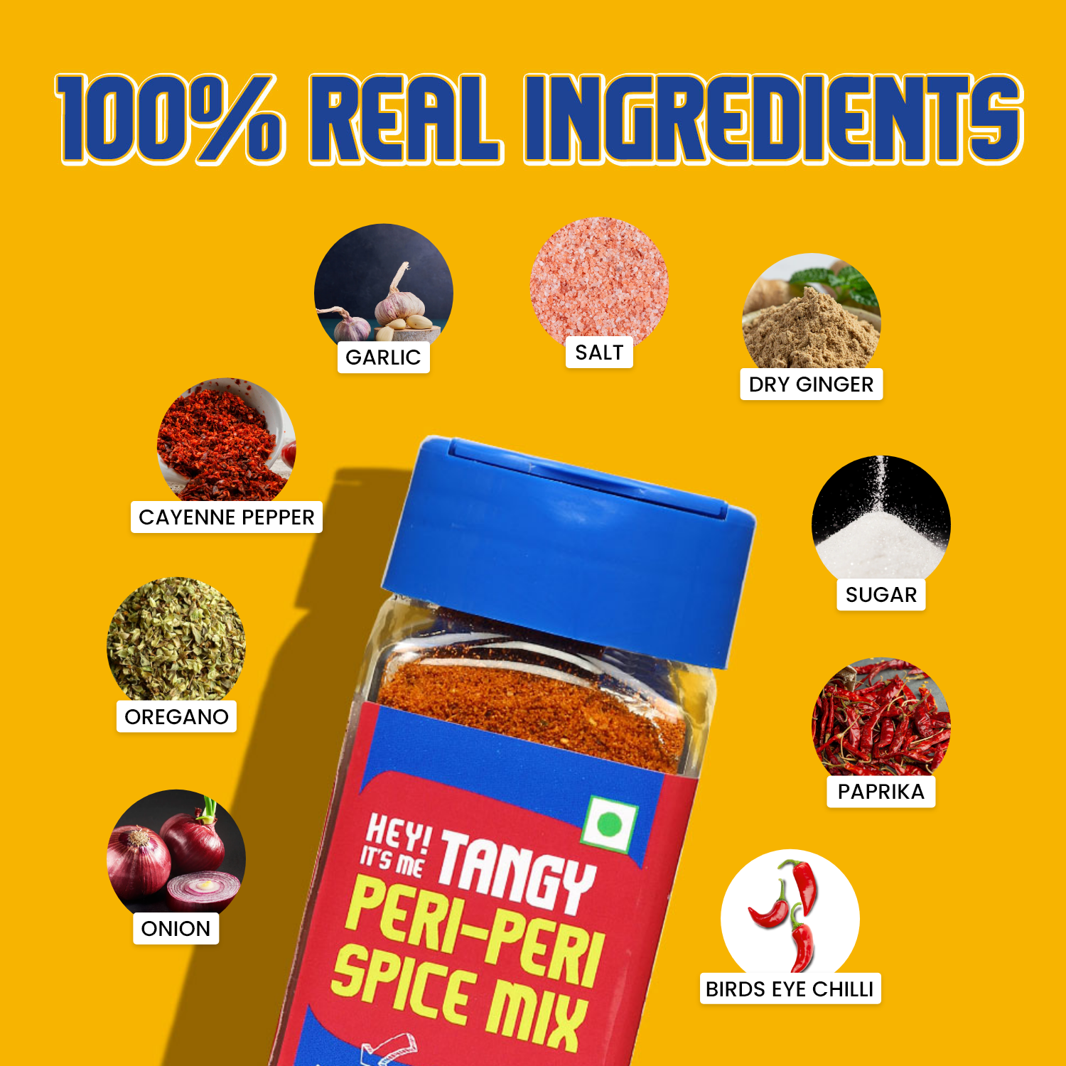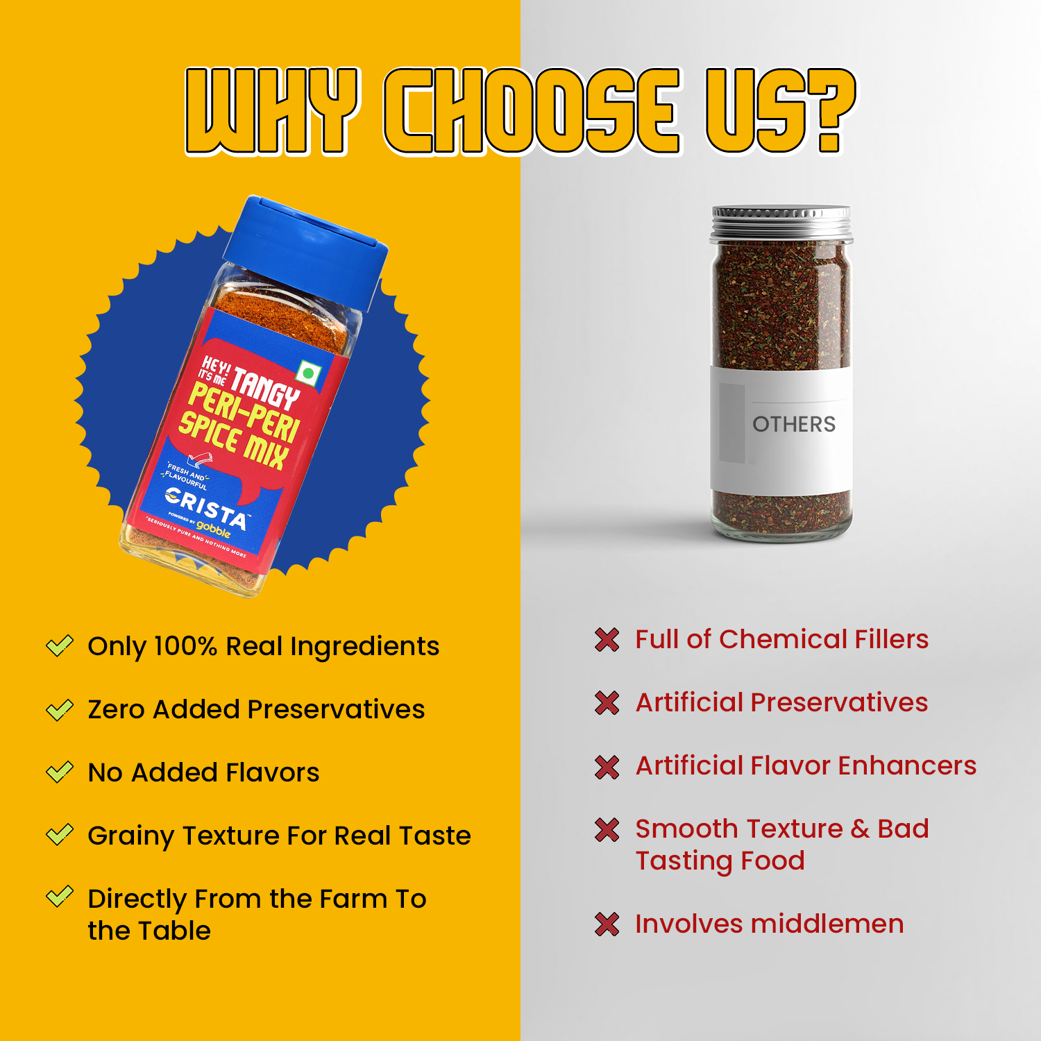 Hey! Its me Tangy Peri-Peri Spice Mix. Team CRISTA's absolute favourite, this spice blend is inspired by our love for anything tangy, salty, sweet and zingy! Introducing CRISTA Tangy Peri-Peri Spice Mix, the perfect proprietary spice dry blend of coarse, whole and ground premium-grade spices! It pairs perfectly with french fries, burgers, steaks and chicken. The key in this blend is a progression in flavour without any one flavour profile overwhelming the other. Freshly machine ground using our sophisticated hammer crushers and micro pulverisers, the blend is mixed in an automatic GMP blender to achieve the desired balance and consistency. PS – you have got to try our recipe for Peri-Peri sauce.