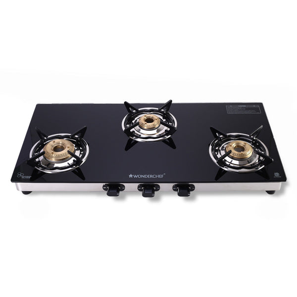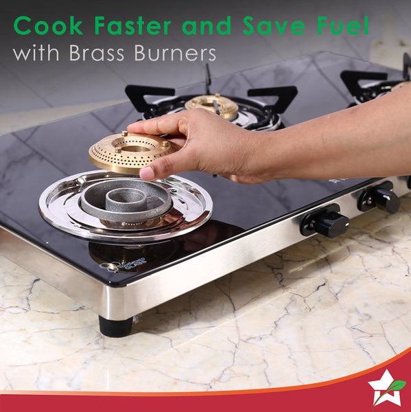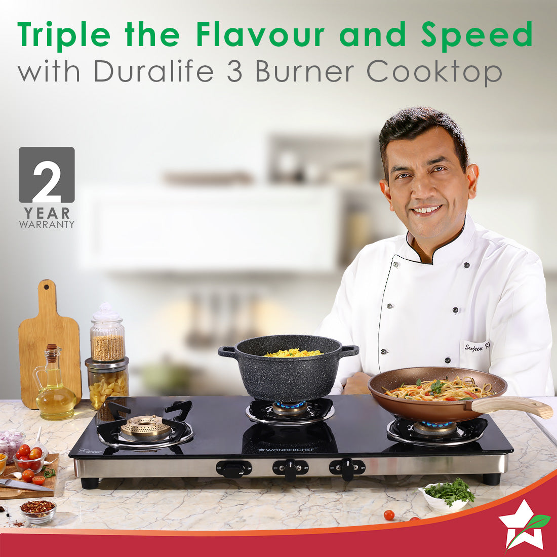 Duralife Slim Glass Cooktop 3 Burner | Heavy Duty Pan Support | Dual Locking System | Easy Grip Sleek Knobs | Brass Burner | Round Stainless Steel Drip Tray | 2 Years Warranty on Glass and Product