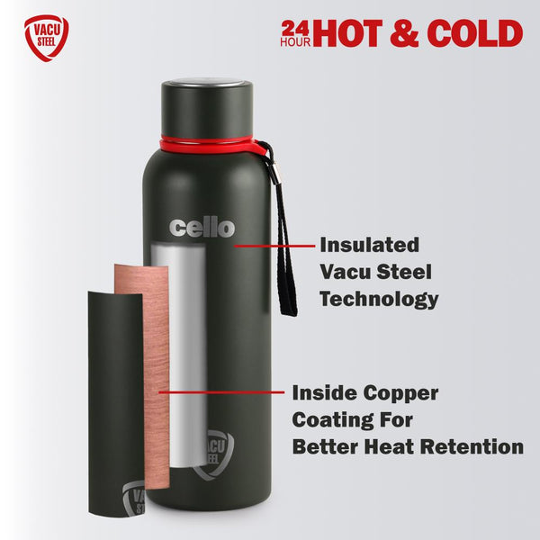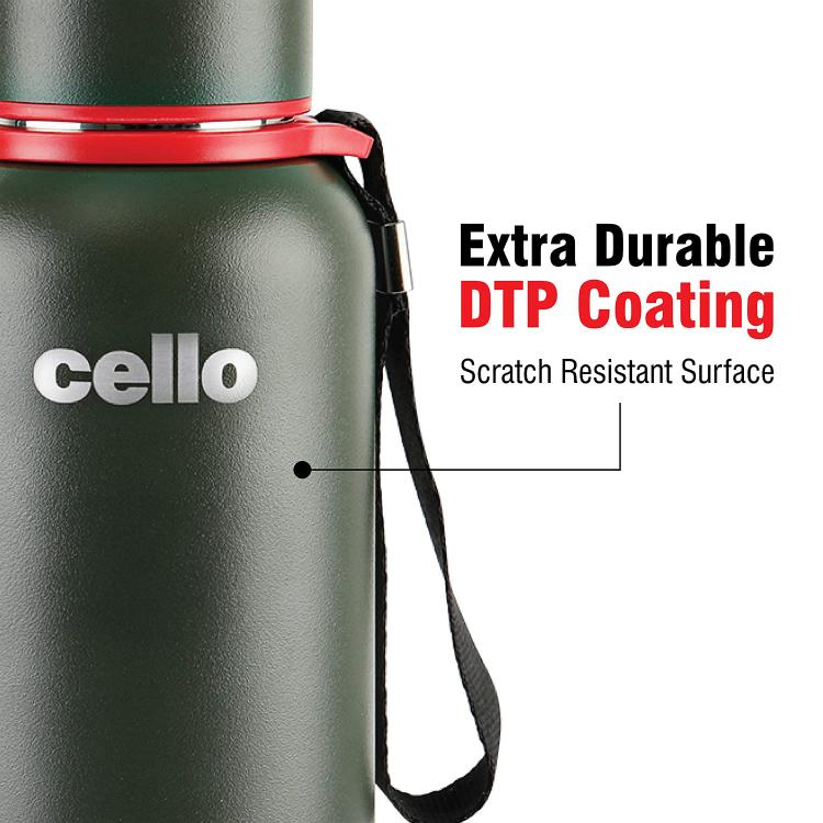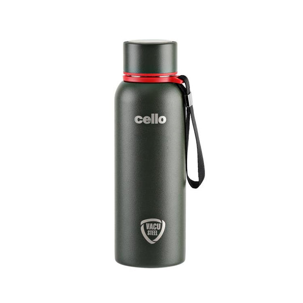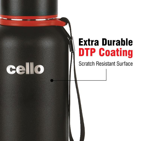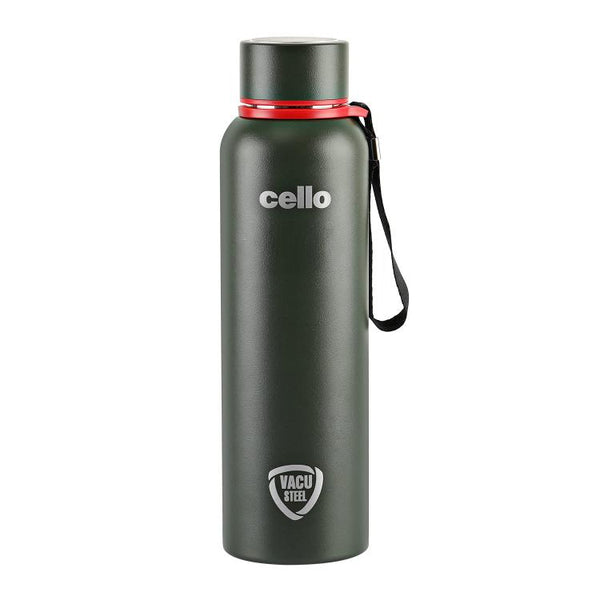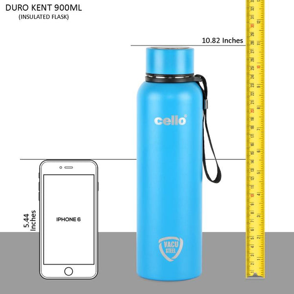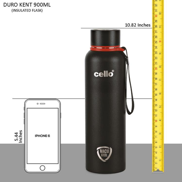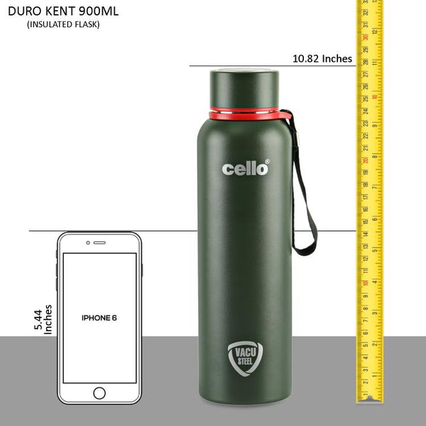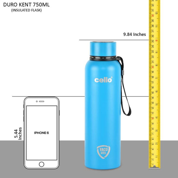 Duro Kent Flask is a Vacusteel Water Bottle from Cello's adventurous Duro Series of Tuff Steel insulated bottles. Designed for those with an adventurous spirit, this flask in sleek black, cool blue, vibrant green, and bold red is the perfect companion for treks, hikes, cycling, gym sessions, school, or office days. Engineered with new and advanced DTP coating, the bottle's vibrant color remains durable, resisting fading or scratching even with daily use. With double-wall insulation and Vacusteel Technology featuring a copper-coated interior, it keeps hot water piping hot and cold water refreshingly cold for extended periods. This leak-proof and odor-free bottle ensures your beverages are stored without oxidation or unpleasant smells, all while remaining rust-free. With a convenient loop for easy carrying, the Duro Kent Flask offers both style and functionality for your active lifestyle. Capacity: 550ml | 750ml | 900ml. Colour - Black, Military Green, Bold Red and Sky Blue