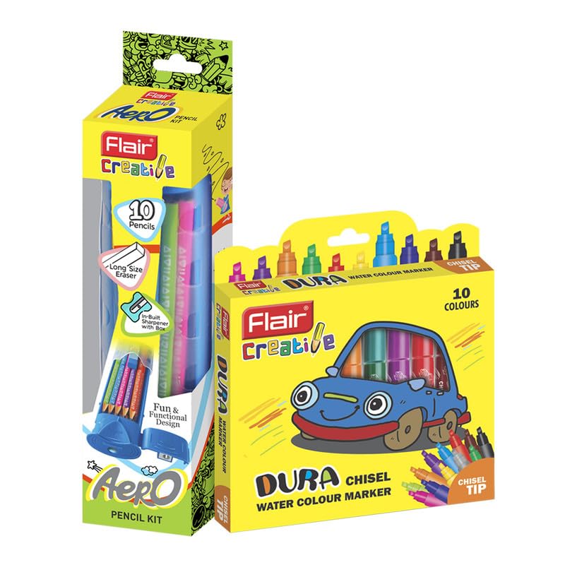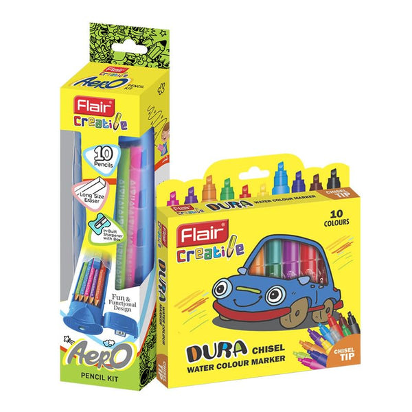 Flair Creative Series 10 Wooden Aero Pencil Kit & 10 Bright Multicolor Shades Chisel Watercolor Pen Art Combo Pack