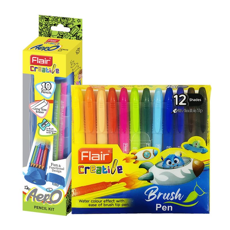Flair Creative Series 10 Wooden Aero Pencil Kit & 12 Bright Multicolor Shades Brush Pen Art Combo Pack