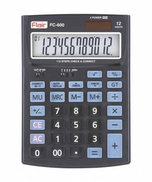 Flair FC-600 Desktop Series Basic Calculator | 12 Digits Calculations with 112 Steps & Correct | Ergonomic Key Design & Dual Power with Solar | Pack of 1