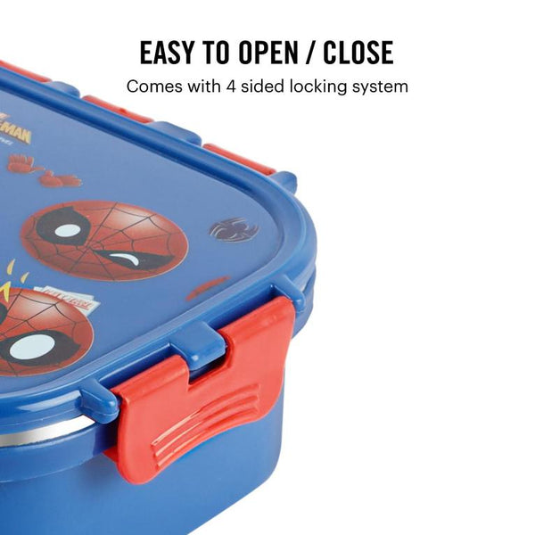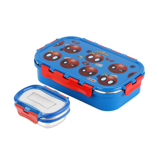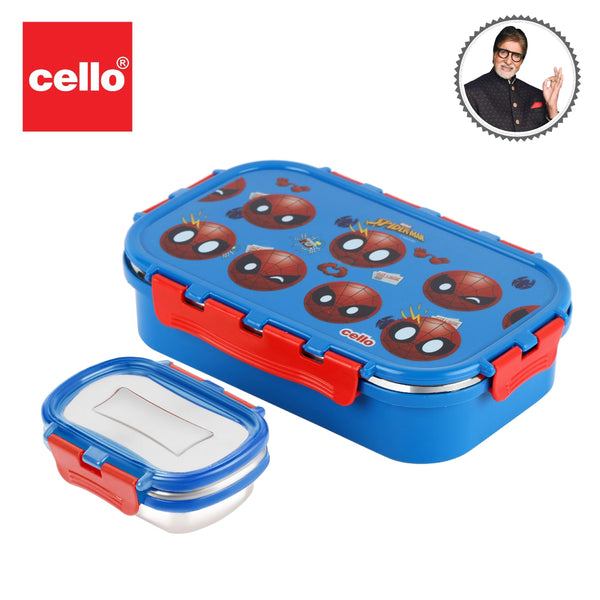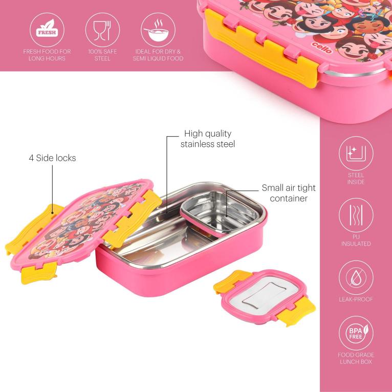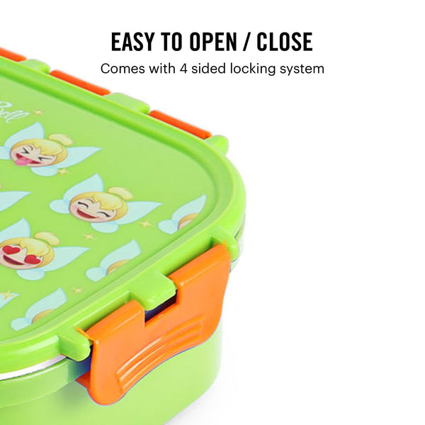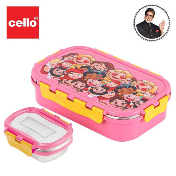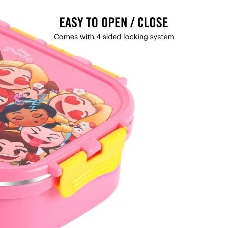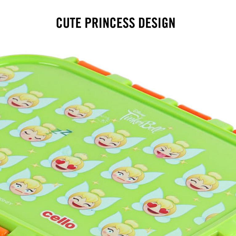 Introducing the fun food insulated lunch box from Cello Kidzbee, a lunchtime companion that's perfect for kids! This big-sized lunch box features delightful Emoji style Disney Princess, Spiderman and Tinker Bell prints that kids will adore. Crafted with care, its inner compartment is made of sturdy stainless steel, while the outer layer is BPA-free plastic. Designed in charming colours, it's easy to carry, fitting effortlessly into backpacks. The lunch box comes with secure side locks and an airtight lid, keeping meals fresh and mess-free. Inside, a leakproof steel container awaits, ready to hold savory gravies and tasty curries. Ideal for school, picnics, and adventures, it's both safe and fun!
