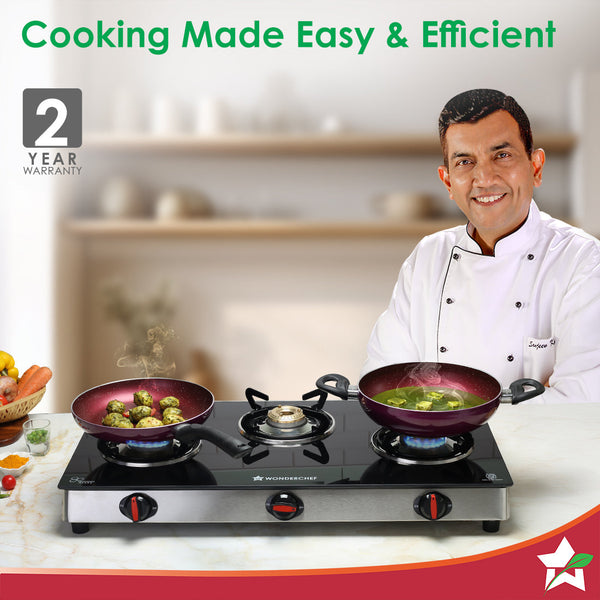 - Efficient Cooking: Highly efficient tri-pin brass burners provide fuel-saving and uniform heating, allowing you to cook faster and more efficiently. 3 burners (2 medium, 1 small) cater to different cooking needs.