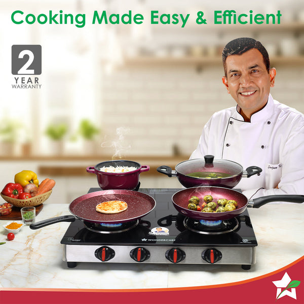 - Efficient Cooking: Highly efficient tri-pin brass burners provide fuel-saving and uniform heating, allowing you to cook faster and more efficiently. 4 burners (2 medium, 2 small) cater to different cooking needs.