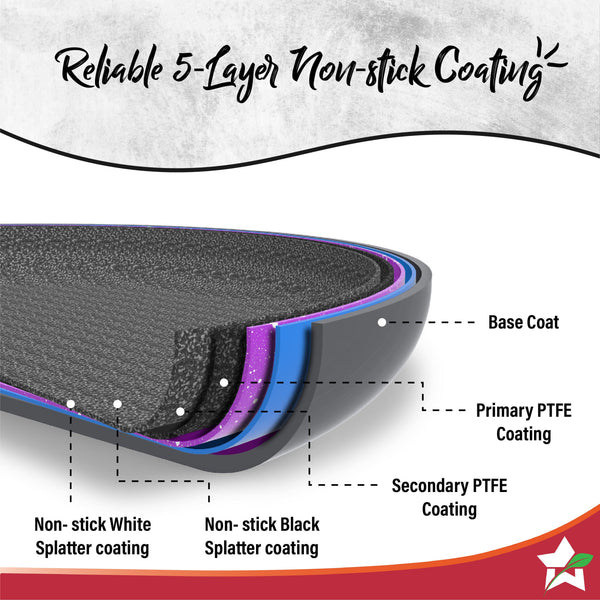 Professional grade Greblon C3+ non-stick coating from Germany is free from PFOA and heavy metals. The coating has been tested for 10000+ cycles for abrasion resistance. This ensures years of usage without any harm that may come from cheap coatings that peel off easily.