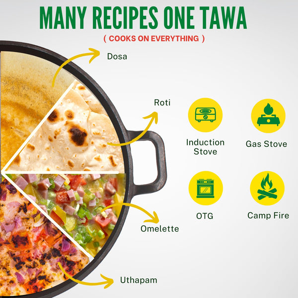 - 🍳 COOKS ON EVERYTHING - Suitable for all cooktops including Induction, Gas, Electric, Ceramic, Halogen, Radiant, and Solid Plates etc. All our cast iron tawa for dosa comes with a double handle for easy handling.