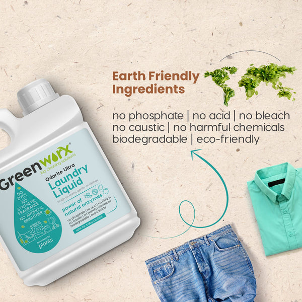 Details: Odorite Ultra Laundry Liquid is a multi-enzyme detergent liquid which offers superior cleaning performance, at low temperatures. Our laundry detergent liquid is the only one in INDIA that contains six enzymes, each offering maximum stain removal (even on complex stains). Phosphate free, eco friendly, acid free, caustic free, hypoallergenic, 100%biodegradable, no harmful chemicals, non-toxic, baby safe, no fading, no bleach, extremely effective, all - around stain removal and whitening effect , at low temperature - Proven to remove the following stains ; Candy , chocolate , coffee , tea , deodorants , dirt , fruit juice , grass , gravy , ink , tomato sauce , lipstick , oil , pet stains , pollen, poop , salsa, wax , wine and more - Highly cost- effective - environment friendly, sustainability- enhancing solution at low temperatures - Safe , non-toxic and environment friendly - Plant based surfactant we believe it is possible to have effective, natural and safe cleaning products that don't cost the earth. Net Volume - 1 Liter