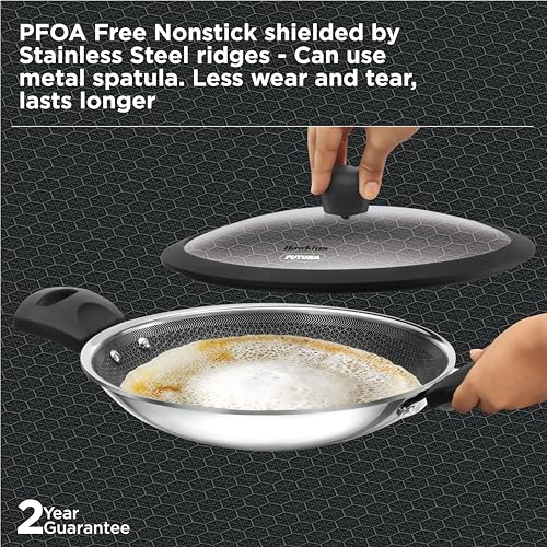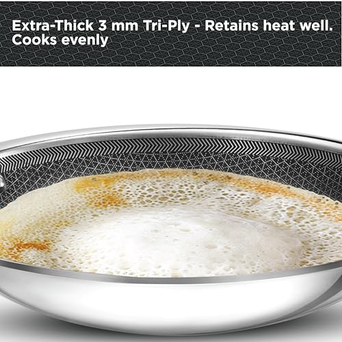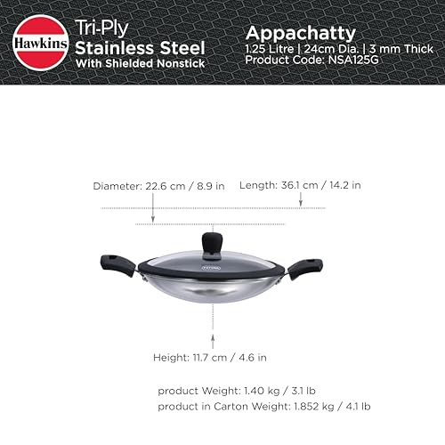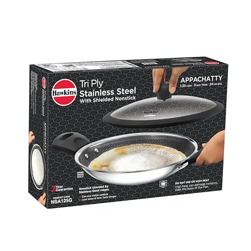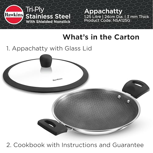 Details: Hawkins Triply Stainless Steel Appachatty is crafted with the PFOA-free nonstick coating shielded by stainless steel ridges. This allows you to use metal spatulas without causing damage and also ensures less wear and tear, ultimately extending the lifespan of your pan. The extra-thick 3 mm tri-ply construction ensures superior heat retention and even cooking. The superior food-grade 18/8 stainless steel interior is hygienic, stronger and more durable. Designed with curved sides, the pan is well-suited for deep-frying and stir-frying, offering versatility. The Round Bottom enhances convenience during stir-frying. Perfect for preparing a range of dishes, the Appachatty excels in crafting Appam, Upma, Akuri, Poha, Firni, Bengal Fish Curry, Stir-Fried Bean Sprouts and Vegetables, Samosa, Egg Curry, and Kadai Masala Chicken. The see-through, toughened heat-proof glass lid locks in flavour and moisture. Suitable for domestic gas stoves.