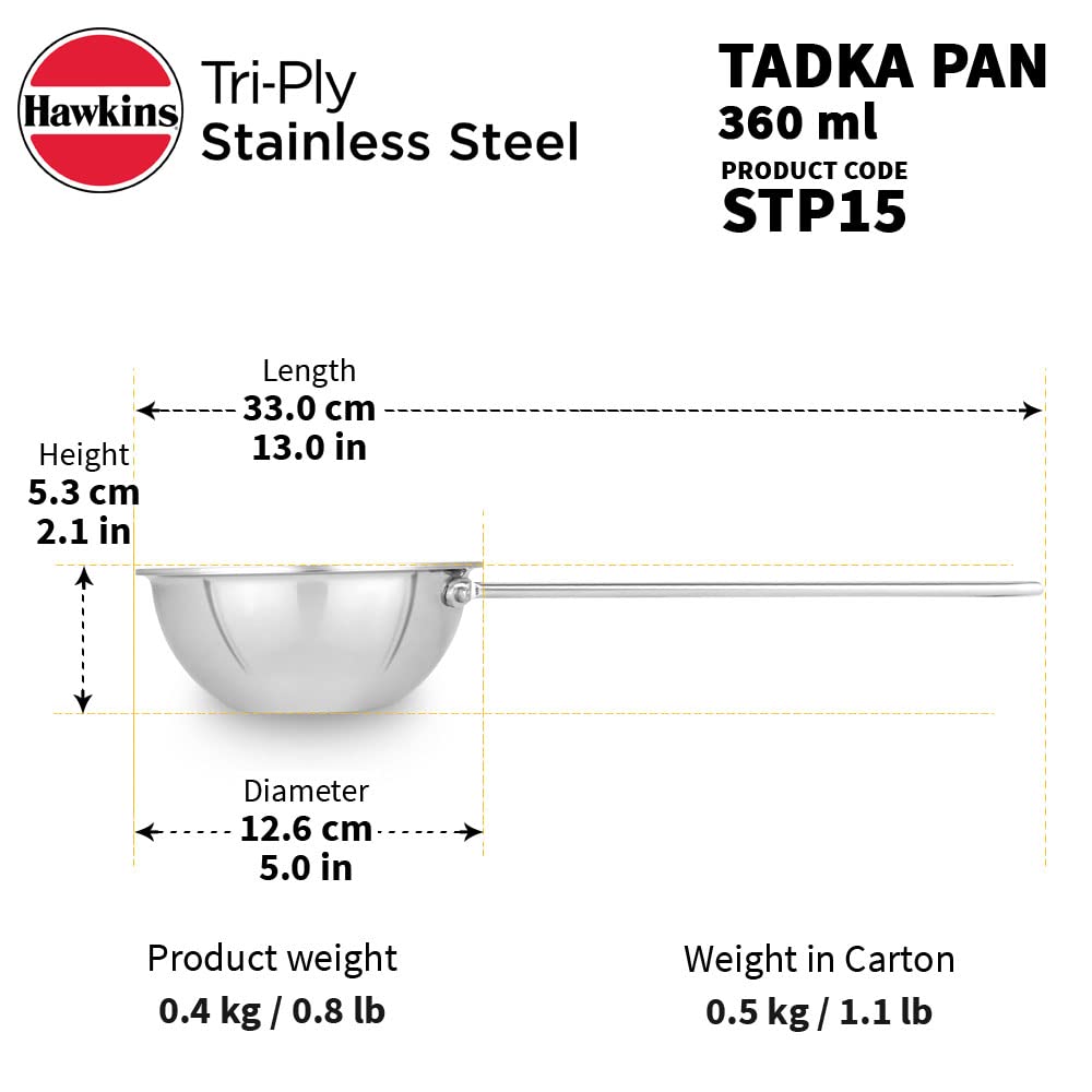 Details: Tadka Pan (Spice Heating Pan) is designed for preparing tadka, quick heating of flavourful spices and is also useful for melting butter or reheating small quantities of food. The extra thickness of the Pans helps you cook without burning with minimal heat control. These pans conduct heat quickly and evenly, so high heat is rarely necessary. Extra thick 2.5 mm Tri-ply Stainless Steel - Strong. Heats quickly & evenly. The sturdy stainless steel handles are stay-cool and comfortable. The Pans can be used on domestic gas, kerosene, electric, ceramic and halogen stoves.