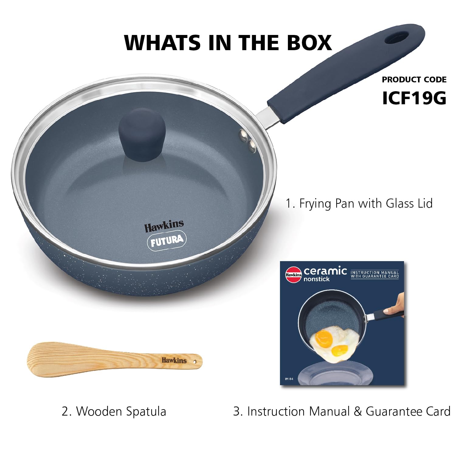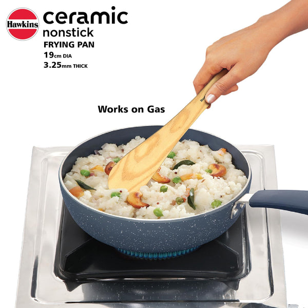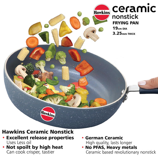 Details: The Hawkins 19 cm Ceramic Nonstick Frying Pan is an induction-compatible frying pan designed to revolutionize your cooking experience. New Hawkins Ceramic Nonstick Inside: This frying pan boasts a cutting-edge ceramic nonstick interior surface that offers excellent release properties. Prepare to be amazed as your dishes require a remarkable 36% less oil while retaining their delectable flavors. Enjoy tasty and healthier meals with every use. Not Spoilt by High Heat: Unlike traditional nonstick pans, this ceramic wonder is not spoilt by high heat. Cook crisper and tastier dishes with confidence, knowing that this pan can handle the heat without compromising its performance. No PTFE, PFOA, PFAS, or Heavy Metals: Embrace a more hygienic and healthier cooking environment with the ceramic-based revolutionary nonstick coating. Say goodbye to harmful chemicals, as this pan is free from PTFE, PFOA, PFAS, and heavy metals, ensuring your well-being with every meal. German Ceramic: Crafted with high-quality German ceramic, this frying pan is built to last. Enjoy the durability and longevity of a pan that can withstand the test of time, meal after meal. 3.25 mm Extra-Thick: The 3.25 mm extra-thick construction ensures rapid and even heating, so you can achieve perfect cooking results every time you step into the kitchen. Attractive Ceramic Coating Outside: Not only is the interior impressive, but the exterior also features an attractive ceramic coating. This coating is scratch and stain-resistant, ensuring that your frying pan will look new and appealing for years to come. No-Hassle Cleaning: Bid farewell to the tedious task of scrubbing stubborn stains and pits. This frying pan is designed for no-hassle cleaning, leaving no stains or pits behind. Sturdy, Stay-Cool Silicone Handle: The Hawkins frying pan features a sturdy yet soft-touch silicone handle that stays cool to the touch. This handle provides a firm and comfortable grip, enhancing your cooking experience and safety. Create healthier and tastier dishes, and enjoy effortless cleaning with the Hawkins 19 cm Ceramic Nonstick Frying Pan. Say yes to delicious, hassle-free cooking and make this frying pan a staple in your kitchen today!