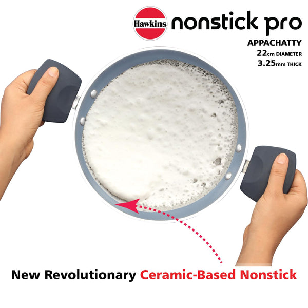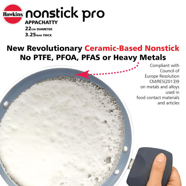Details: The New Revolutionary Nonstick Pro Appachatty is a cutting-edge cookware innovation designed to enhance your cooking experience. It features a Hawkins Ceramic Nonstick coating on the inside, offering excellent release properties. This means that food effortlessly slides off the surface, requiring less oil for cooking—up to 36% less oil compared to traditional nonstick cookware. The result is healthier meals with reduced oil consumption. One remarkable feature of this nonstick coating is its ability to withstand high heat without spoiling. This allows you to cook at higher temperatures, achieving crispier and tastier results. The German Ceramic used in this nonstick coating is of high quality, ensuring durability and longevity of the cookware. In terms of safety and health, the New Revolutionary Nonstick Pro Appachatty is free from PTFE, PFOA, PFAS, and heavy metals. These harmful substances can be detrimental to your well-being. By eliminating them, this cookware ensures a healthy and hygienic cooking experience. The Appachatty is designed with sturdy, stay-cool handles made of soft-touch silicone. These handles provide a firm and comfortable grip, allowing you to handle the cookware with ease and confidence. Cleaning the New Revolutionary Nonstick Pro Appachatty is a breeze. Its nonstick surface prevents food from sticking, making it hassle-free to clean. You won't have to worry about stains or pits on the surface either. The cookware stays looking new for years, maintaining its sleek appearance even with regular use. In summary, the New Revolutionary Nonstick Pro Appachatty boasts a Hawkins Ceramic Nonstick inside, providing excellent release properties and reducing oil usage. Its German Ceramic construction ensures high quality and durability. With no harmful substances like PTFE, PFOA, PFAS, or heavy metals, it guarantees a healthy and hygienic cooking experience. The sturdy silicone handles offer a comfortable grip, and the nonstick surface ensures effortless cleaning with no stains or pits. Upgrade your cooking with this revolutionary nonstick cookware.