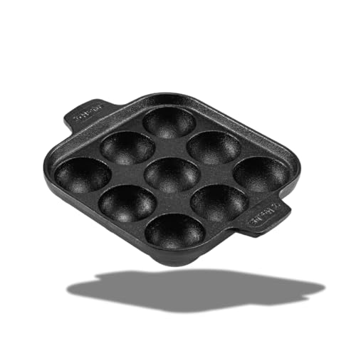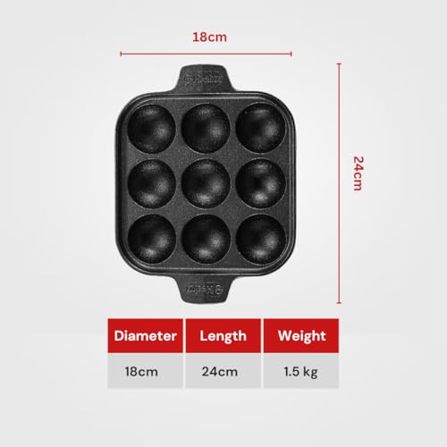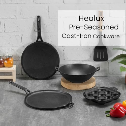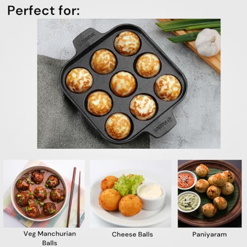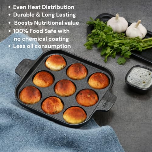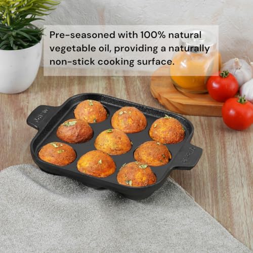 Healux 18cm Pre-Seasoned Cast Iron Paniyaram Pan/Paddu pan/Appam Maker/Appe pan – 9 Cavity | Toxin Free | Naturally Non Stick | Gas Base