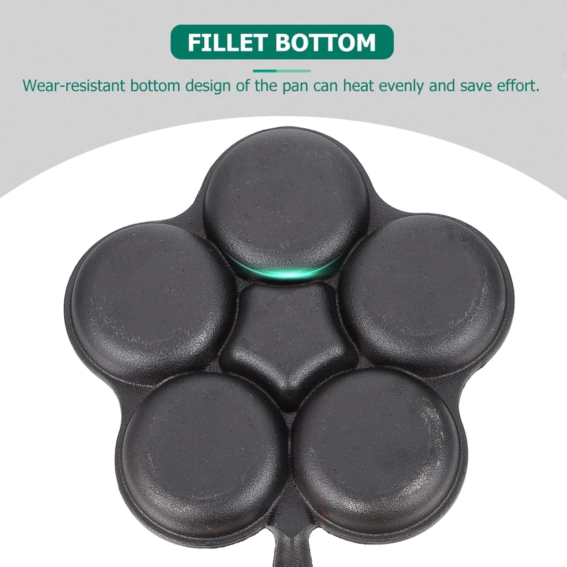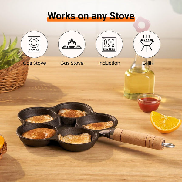HomeEssentials Cast Iron Egg Pan - 6 Hole Nonstick Skillet with Wood Handle | Omelette Pan | Mini Uttapam Pan | Appam Patra | Litti Maker | Nonstick Pan for Eggs,Dumplings | Egg Frying Pan | 42 cm