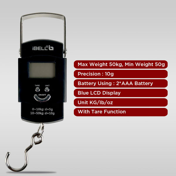 iBELL LS050M Electronic Luggage / Fishing Weighing Scale with Stainless Steel Hook, LED Display & Tare Function.