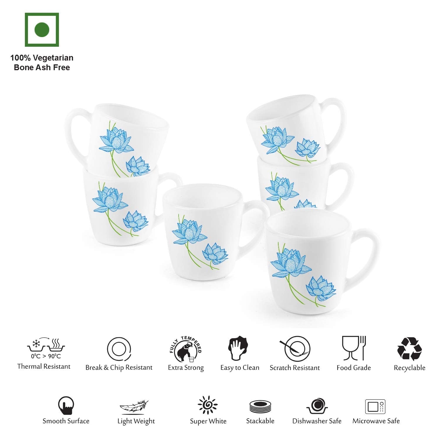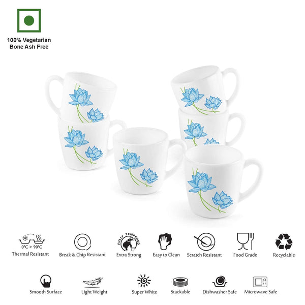 Cello Ricca Opalware Small Mug set of 6 in Neelkamal 100ml is crafted with precision using the most advanced German technology and adhering to European standards. Proudly made in India, these mugs are 100% vegetarian, bone ash-free, and composed of environmentally friendly materials.