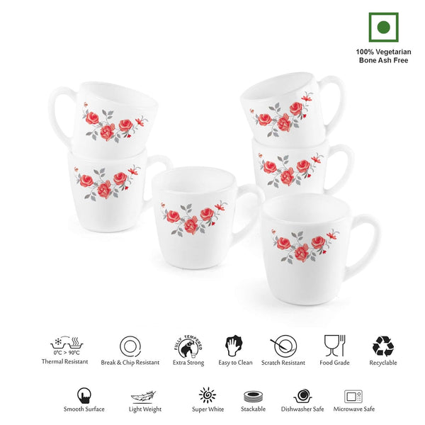 Cello Ricca Opalware Small Mug set of 6 in Red Rose Fantasy 100ml is crafted with precision using the most advanced German technology and adhering to European standards. Proudly made in India, these mugs are 100% vegetarian, bone ash-free, and composed of environmentally friendly materials.